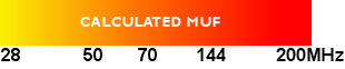 The calculated average MUF (Maximum Useable Frequency) is shown on the map in the grid square* at the contact’s mid-point, where the assumed ionospheric refraction occurs. If high MUF is being reported, the grid square reference changes to the MHz value of the MUF at that location. The colour of the square is scaled between yellow and red for MUF values between 28 and 200 MHz. If the data is not updated sooner, it remains visible for 15 minutes and then disappears.