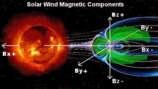 Bz = solar wind magnetic polarity (negative/south is good for aurora).